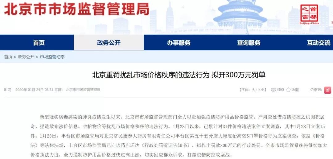 如北京市丰台区市场监督管理局,已对某药店大幅度抬高N95口罩价格的行为立案调查,并拟作出罚款300元的行政处罚。