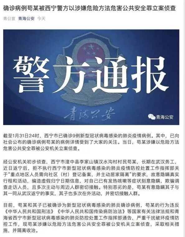 对不配合隔离、隐瞒症状、欺骗调查走访人员的苟某,以涉嫌以危险方法危害公共安全罪立案侦查,并隔离收治。