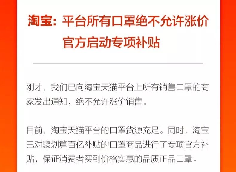 还好,淘宝发出了绝不允许涨价的通知,并启动官方补贴,以确保消费者买到价格实惠的正品口罩。